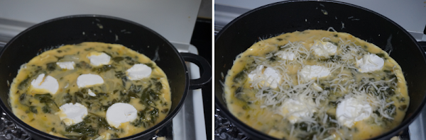 En una sartén que pueda ir al horno, ponemos un poco de aceite la ponemos al fuego y añadimos la mezcla de la tortilla, dejamos unos minutos se haga la base de la tortilla. cuando veamos que alrededor se va cuajando, añadimos el queso de cabra y un poco de queso rallado.