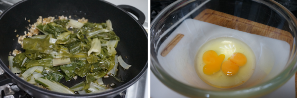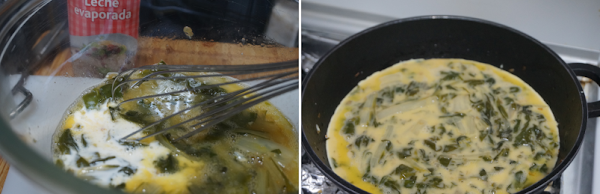 Batimos los huevos con las claras y la nata (crema de leche), una vez está bien mezclado incorporamos el sofrito de cebolla y acelgas, mezclamos.