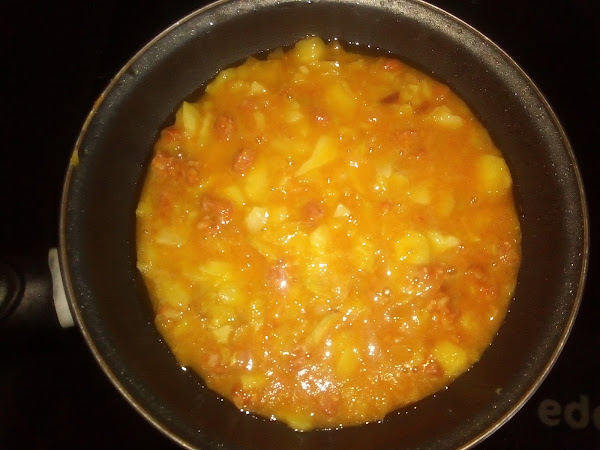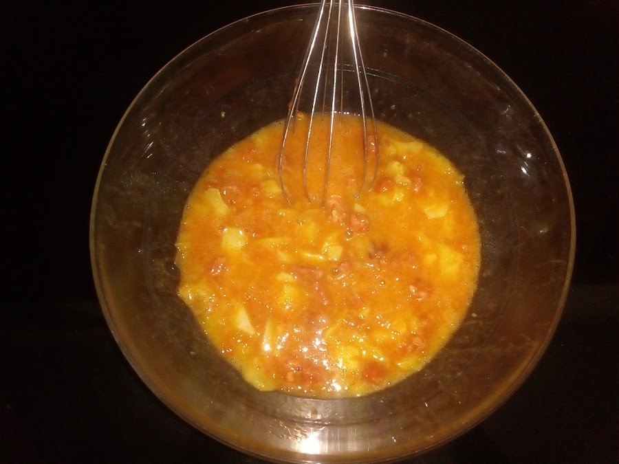 Batimos los huevos y echamos las patatas una vez que ya estén cocinadas y sin nada de aceite (no os olvidéis que este aceite os servirá para otras preparaciones). Añadimos también el sofrito y le damos un par de vueltas para que se mezclen todos los ingredientes.