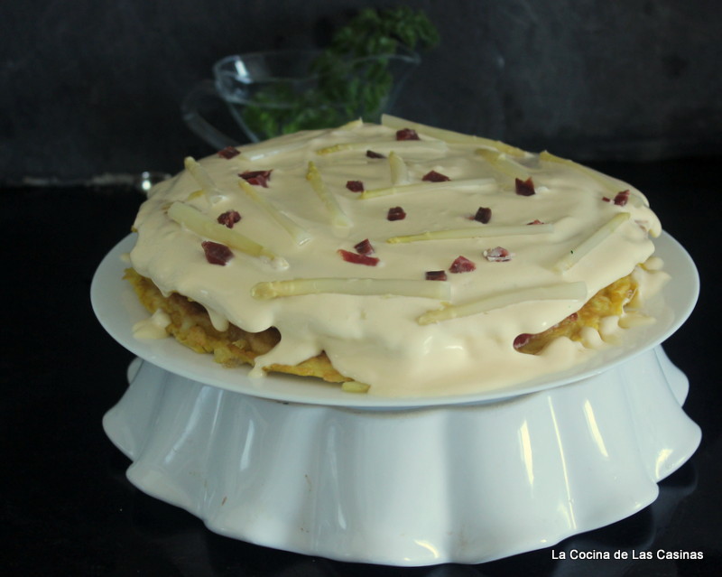 Coloca en la fuente de servir la primera tortilla, añadir el jamón en lonchas procura que quede cubierta toda la superficie, incorpora las yemas de espárrago. Las mías totalmente ruinosas, es imposible encontrar yemas que sean de aquí, vienen de Perú o China y las envasan en Navarra, conste que son de una marca hiper reconocida ¿hay derecho a vender o llamar a eso yemas de espárrago?. En fin como no vamos a ninguna exposición al menos le da el sabor y el aroma. Reserva unas cuantas yemas y algo de jamón para el adorno final.
