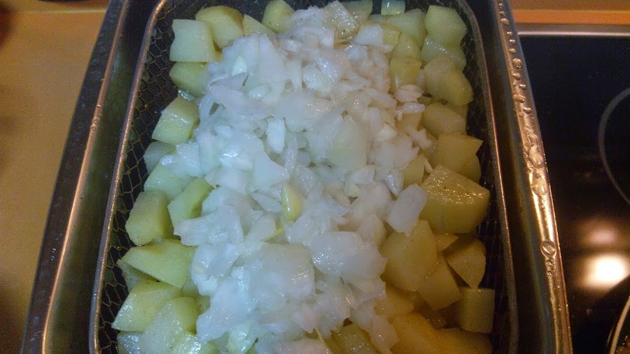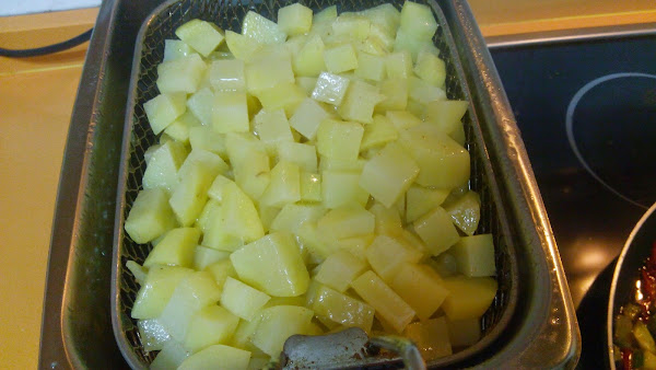 Ahora pelamos las patatas y las cortamos a dados. Las freímos.