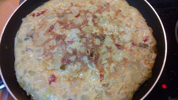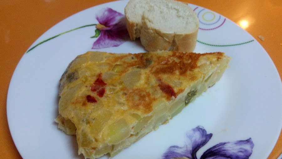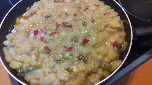 Y en una sartén amplia con un poquito de aceite de oliva, vertemos todo, salpimentamos al gusto y hacemos la tortilla.
