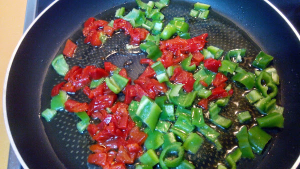 En una sartén echamos un chorreón de aceite. Calentamos. Cortamos los pimientos en dados y los echamos a la sartén.