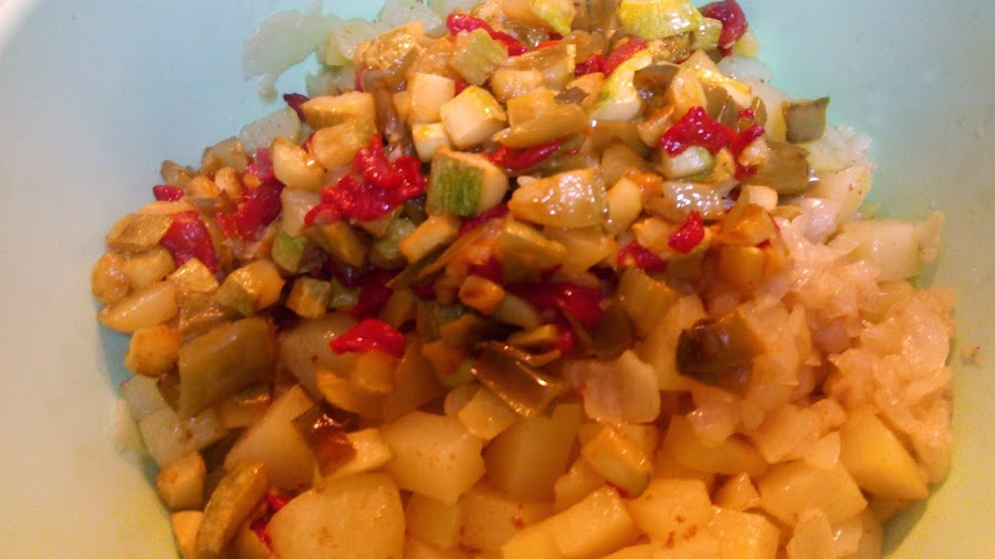 Ahora lo mezclamos todo, las verduras que hemos hecho anteriormente y las patatas con la cebolla.