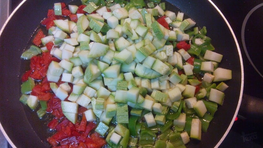 Añadimos el calabacín también cortado a dados. Salamos al gusto. Dejamos que se fría todo. Reservamos.