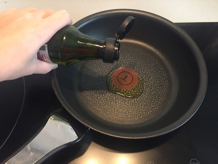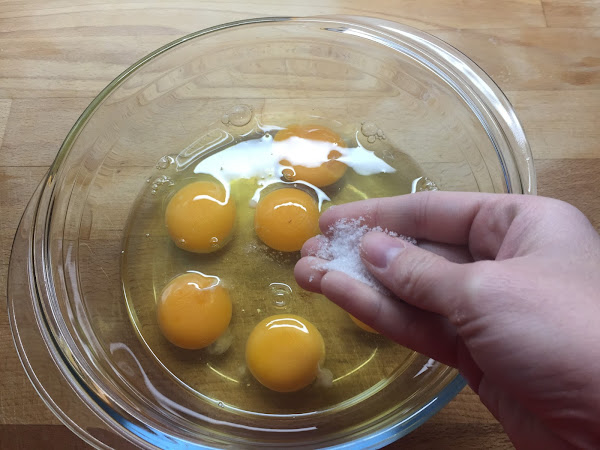 Primero echamos los huevos en un bol y los batimos. Añadimos una pizca de sal y ponemos a calentar una sartén antihaderente con un poquito de aceite.
