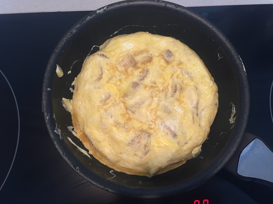 Cuando la parte de abajo esté dorada, es el momento de darle la vuelta a la tortilla, la parte mas difícil de la receta jeje. Nos ayudamos con un plato, giramos y devolvemos la masa a la sartén. En unos minutos se dorará la parte de abajo y ¡¡YA ESTÁ LISTA PARA COMER!!