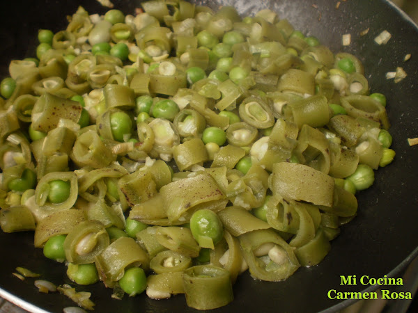 Agregar a la sarten las habas y los chicharos, bien escurridos de agua y remover durante un minuto, Añadir el vino, llevar a ebullición y dejárlo reducir durante unos minutos. Sacar de la sartén la verdura escurriendo bien.