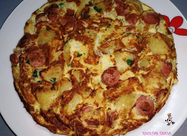 Pelamos,lavamos, picamos las papas en daditos y freímos. En un bol batimos los huevos,ponemos un chorrito de leche,añadimos un poquito de sal,picamos el perejil muy pequeñito y lo añadimos a los huevos. En una sartén con una gota de aceite ponemos las salchichas troceadas,le damos vuelta y vuela y lo añadimos a los huevos. Una vez fritas las papas las ponemos en el bol con los huevos,las salchicas y el perejil. En una sarten ponemos un poco de aceite y metemos todo en la sarten a fuego bajo ,vamos dando vuelta hasta que esté hecha.