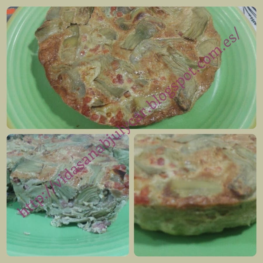 Poner las alcachofas congeladas en la cubeta de la GM E, añadir un poco de sal, tapar con válvula cerrada, programar menú presión, vapor, 130º, 4 minutos, mientras batir los huevos con la leche, sal y el jamón, cuando termine la olla despresurizar manualmente, abrir, aquí yo he puesto la tortilla en un molde de silicona de 19cm, porque quería una tortilla altita, pero se puede hacer directamente en la cubeta.