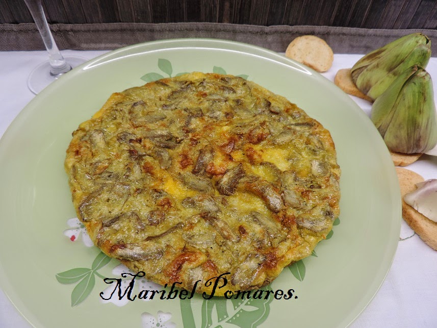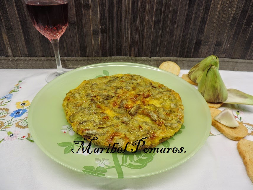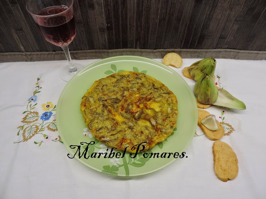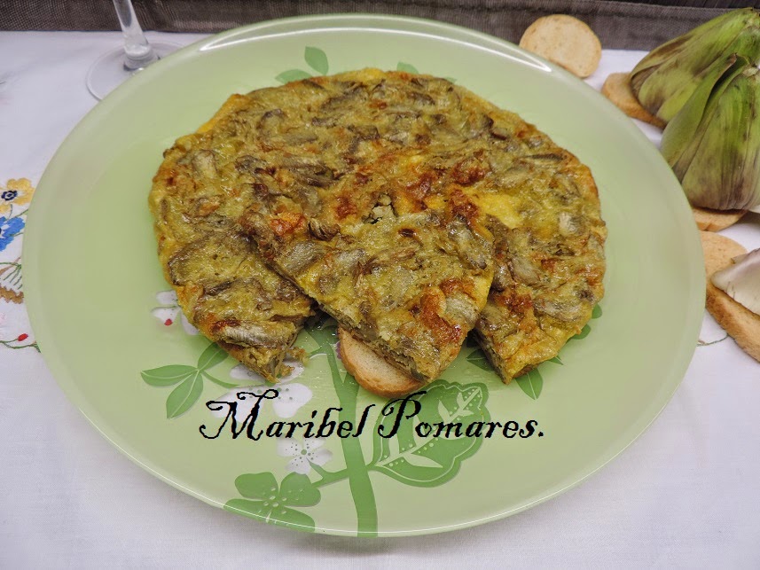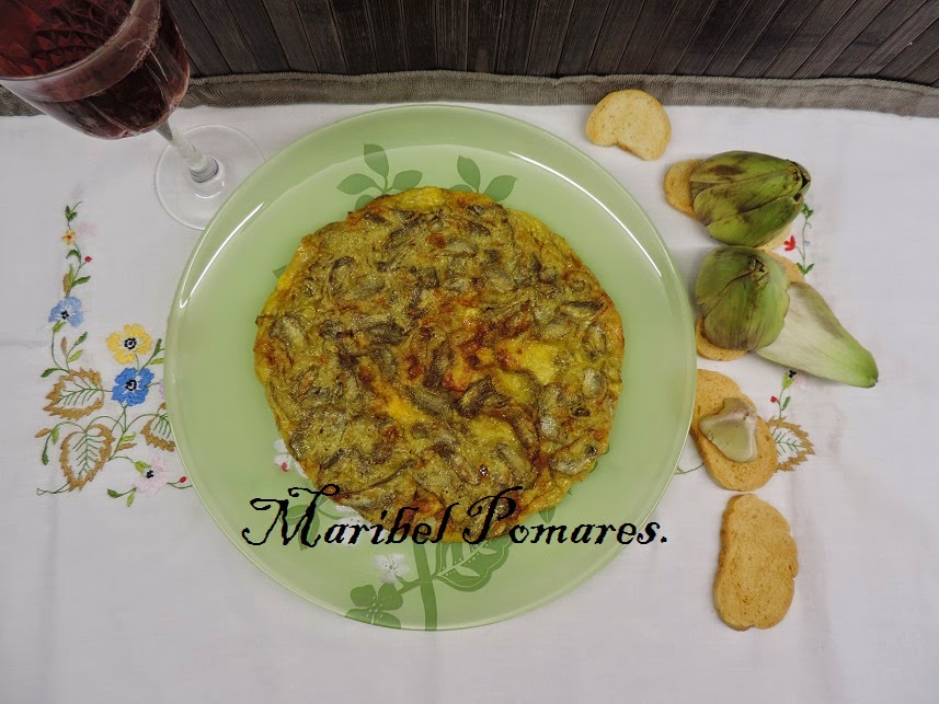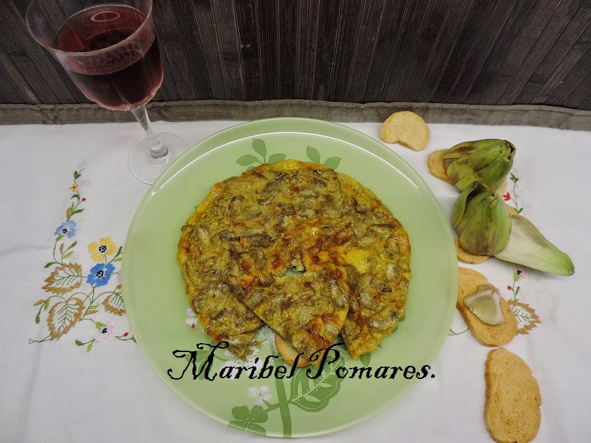 Pelamos la alcachofas y las ponemos con agua, zumo de limón para que no se pongan negras, mientras las vamos cortando.