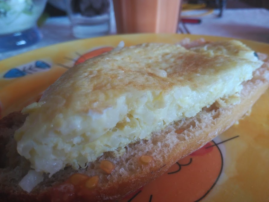 - La básica de cualquier tortilla: batimos bien los huevos con sal, añadimos el arroz, mezclamos...y cuajamos la tortilla en una sartén, como la hacemos siempre.