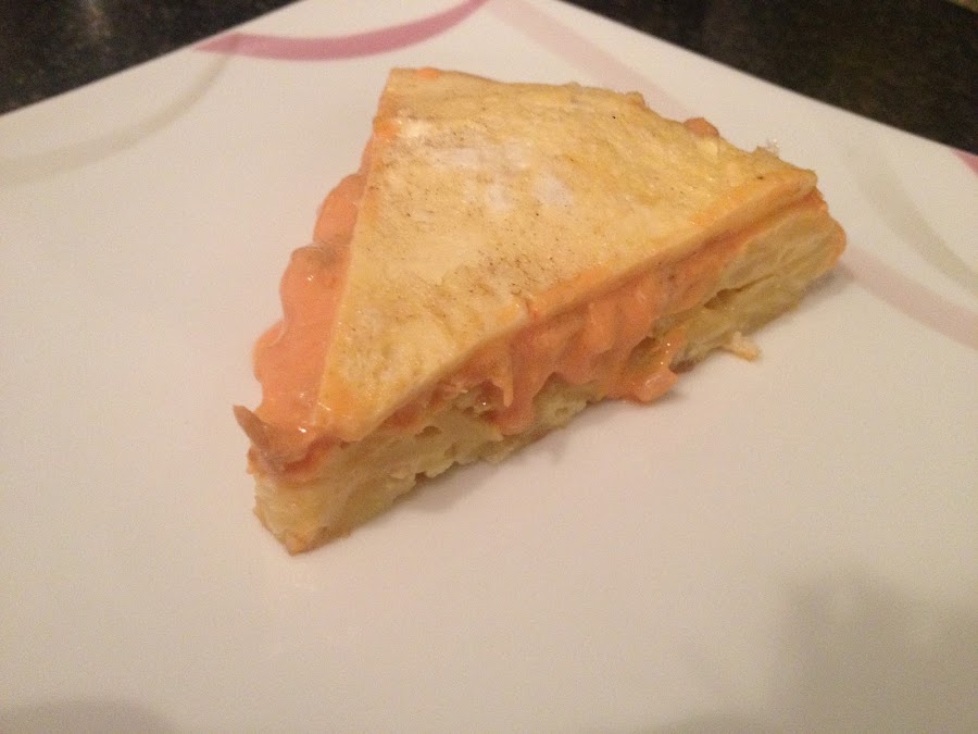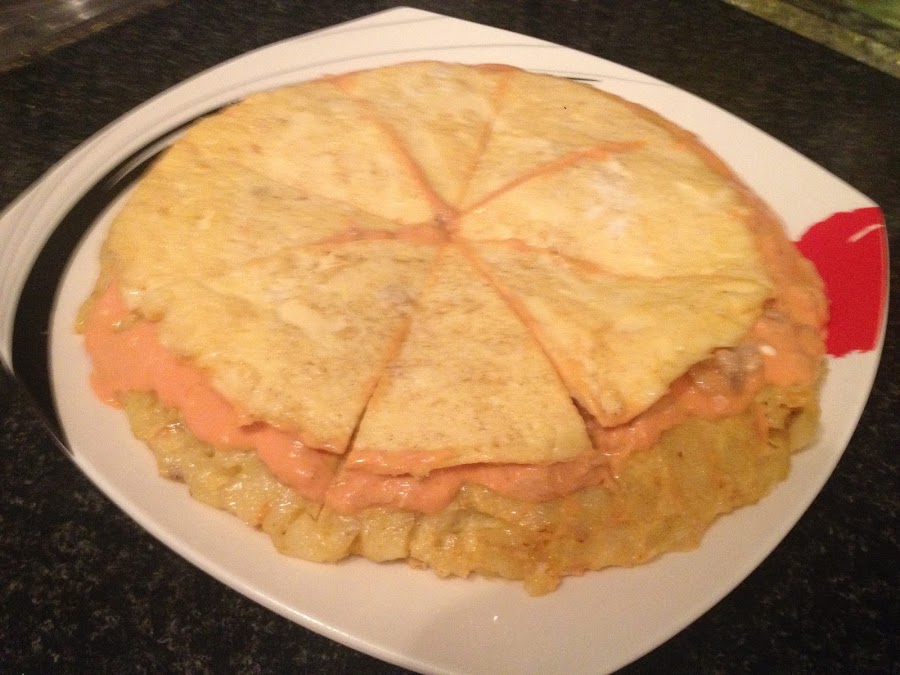 7º - Ahora esparcimos la mezcla de atún y tomate que teníamos reservado hasta cubrir por completo la tortilla . Batimos bien los huevos que quedan y calentamos la sartén nuevamente con unas gotitas de aceite .