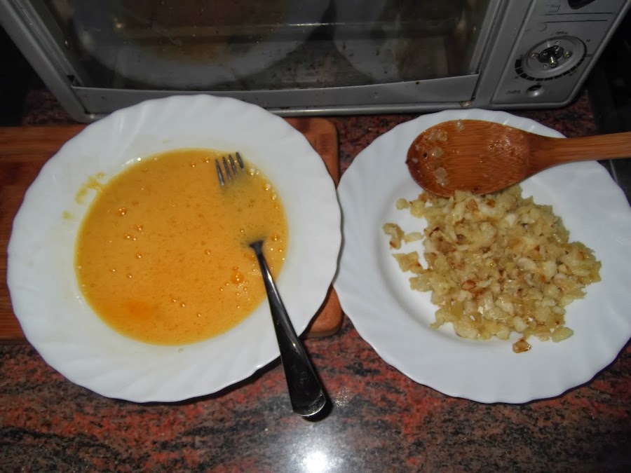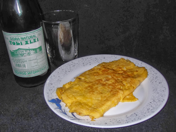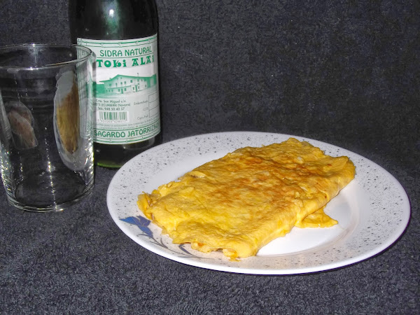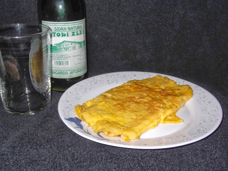 Una vez que la cebolla está transparente, se añade el bacalao y lo pochamos junto con la cebolla. Una vez que está todo bien pochado lo sacamos a un plato y batimos los huevos, los echamos en la sartén y cuando están un poco cuajados, añadimos la mezcla y un poco de perejil, le damos varias vueltas a la tortilla hasta que esté cuajada, y ya está lista para comer. Como podéis ver en la foto la tortilla es alargada y no redonda, pero en la sidrerías la presentan así, lo que pasa es que mucho más goda porque suele ser para más comensales, en este caso es para un comensal.