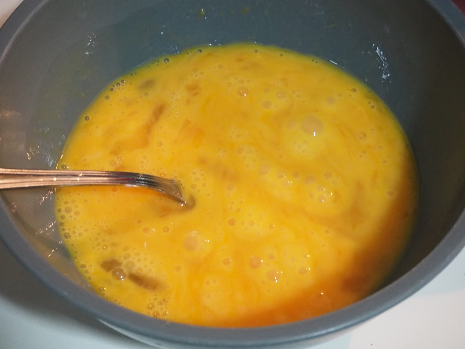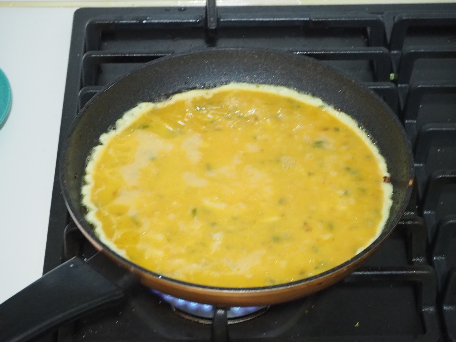 - Añadimos el sofrito de bacalao y mezclamos bien, y a continuación, en la misma sartén en la que hemos preparado el bacalao y con un poco de aceite caliente, ponemos a cuajar la tortilla.