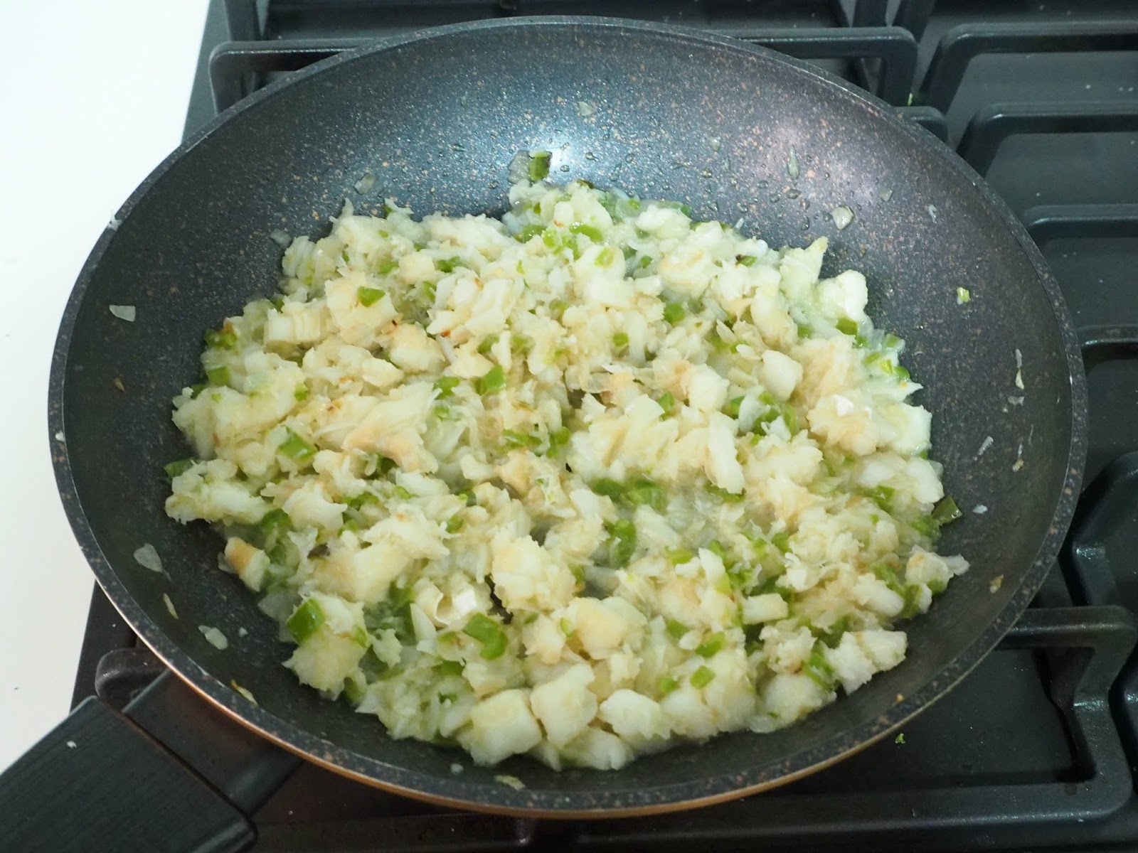 - Añadimos entonces el bacalao desmigado y removemos bien (no echamos sal porque el bacalao ya lleva). Dejamos hacer, removiendo de vez en cuando, hasta que quede todo bien hecho.
