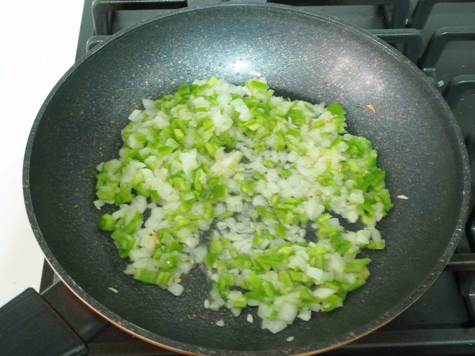 - Cuando empiece a estar tierna, añadimos el pimiento, removemos y dejamos hacer hasta que quede todo pochado.