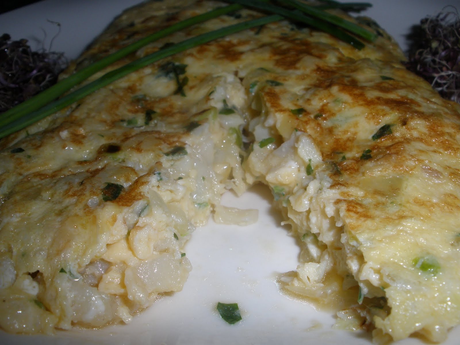 ELABORACIONPicamos la cebolla finita, y los ajetes. Rehogamos.Añadimos el bacalao troceado y damos unas vueltas(no conviene hacerlo demasiado para que no este seco)Batimos los huevos, y agregamos a la preparacion anterior espoloreando con bien de perejil, y un poco de pimienta molida. Preparar la tortilla, de modo que quede jugosa, con el huevo que no esté cuajado del todo por dentro.Emplatamos y decoramos con unos germinado de lombarda a los que aliñaremos con un poco de AOVE, y sal.Ponemos un par de ramas de cebollino por encima( tambien podeis presentarlo con el cebollino picado)