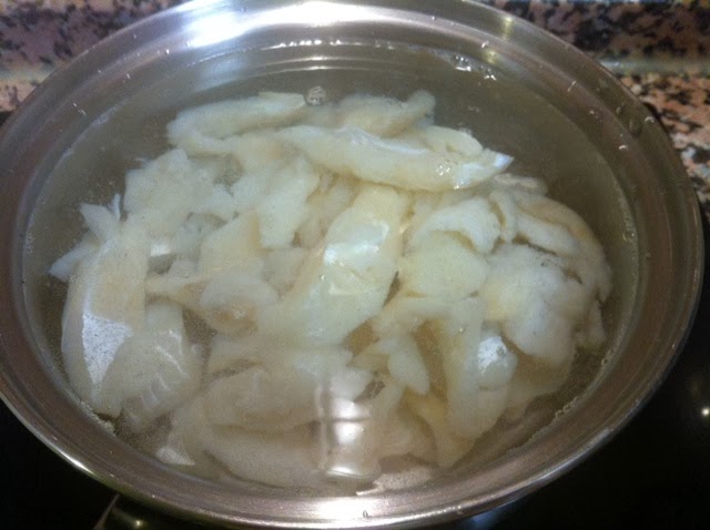 Mientras se pocha, poner un cazo con agua fría y una pizca (pequeña) de sal y añadir el bacalao para escaldar. Cuando empieza a hervir, apagar en 1 minuto, escurrir el agua y reserva el bacalao.