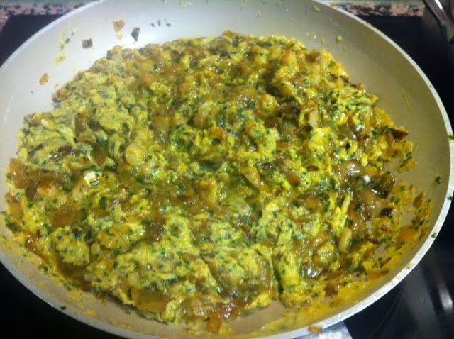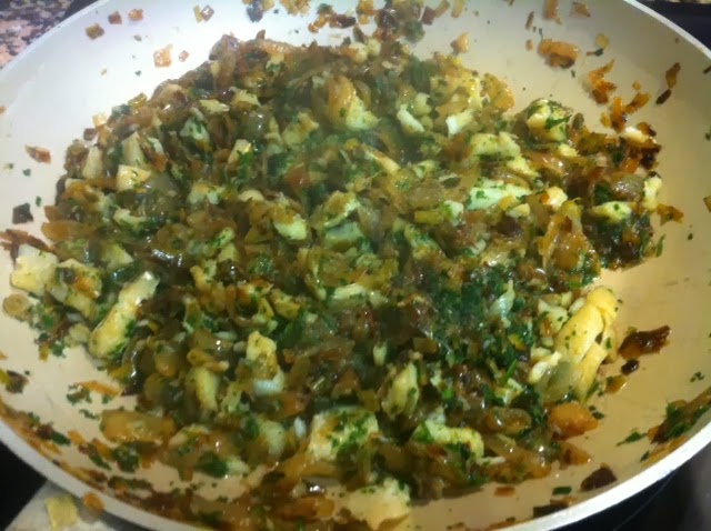 En un cuenco, batir los huevos y añadir el contenido de la sartén (escurrir el exceso de aceite si hiciera falta) y volver a echar la mezcla a la sartén con una cucharada de aceite.