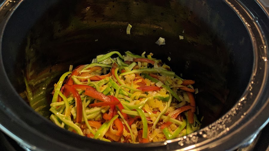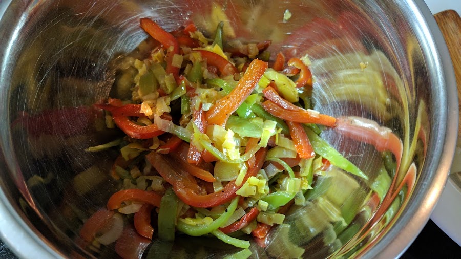 La cubeta tarda en coger calor pero luego lo guarda muy bien. Deja que se haga el puerro unos 20 minutos. Mientras haz tiras finas los pimientos. Añade a la cubeta y deja todo junto otros 20 minutos. Salpimenta los puerros y los pimientos y saca a un bol.