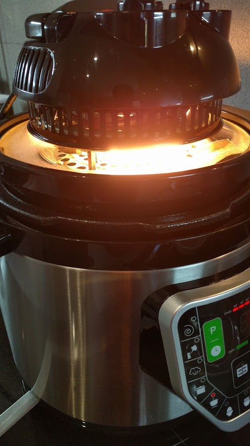 Incorporamos el queso y los huevos y removemos. Sin limpiar la cubeta, untamos fondo y unos 4 cm de las paredes con aove y volcamos la mezcla. Ponemos la tapa de cristal. Seguiremos cocinando a 120 grados durante 15 minutos por lo menos. Pasado el tiempo colocamos el cabezal dorador sin apagar la olla, a 150 grados unos 10 minutos y luego subimos a 170 para que termine de dorarse. En este momento apaga la olla, que solo funcione el cabezal. Para sacar la tortilla da la vuelta sobre un plato. Ponte guantes protectores porque quema