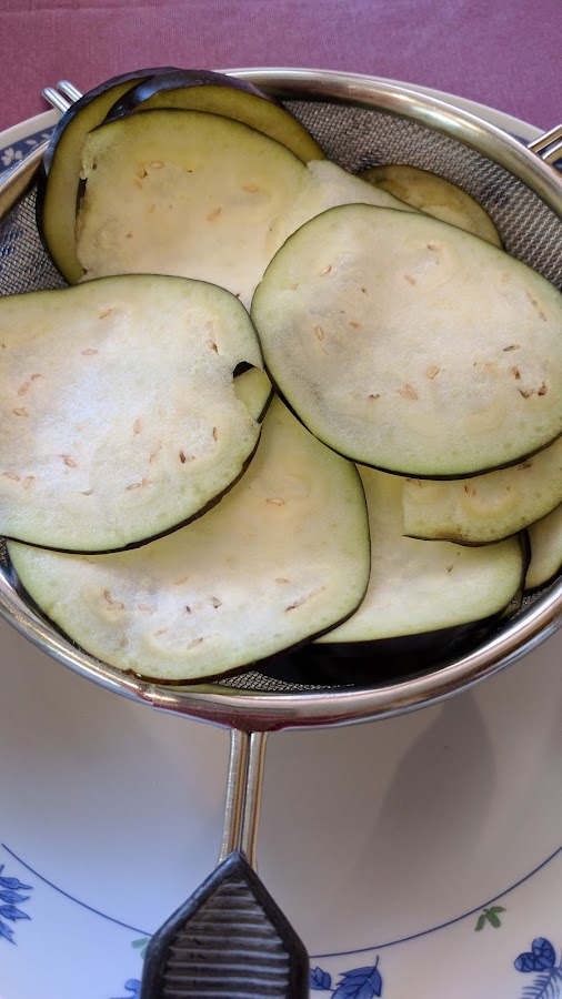 5 huevosLava y corta la berenjena en rodajas muy finas. Puedes hacerlo con mandolina. Sala las rodajas y ponlas en un colador para que escurra el agua