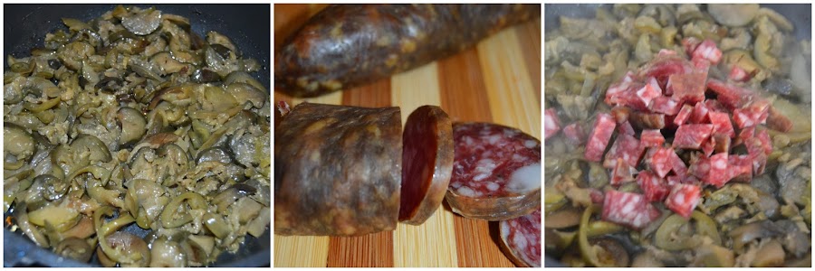 Lavamos y cortamos en pequeños gajos las berenjenas (no tienen porqué ser perfectos). Las vamos poniendo en agua con sal para quitarles el amargor. Las dejamos en el agua durante 10-15 minutos. Las escurrimos y las pasamos a una sartén anti-adherente con dos o tres cucharadas de aceite de oliva virgen y con el fuego lento. Movemos de vez en cuando, las tapamos y dejamos que se cocinen poco a poco hasta que estén cocinadas. Mientras cortamos un salchichón de buena calidad ahumado en taquitos, que incorporaremos a la berenjena cuando este bien cocinada y removemos para que quede integrado.