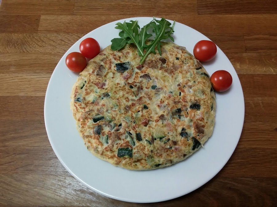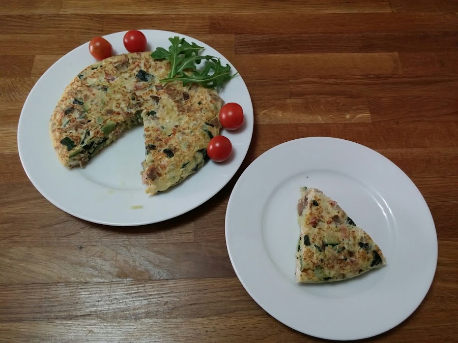 Mezcla el sofrito con el beicon y después todo con el huevo.