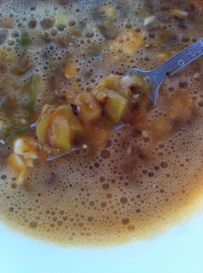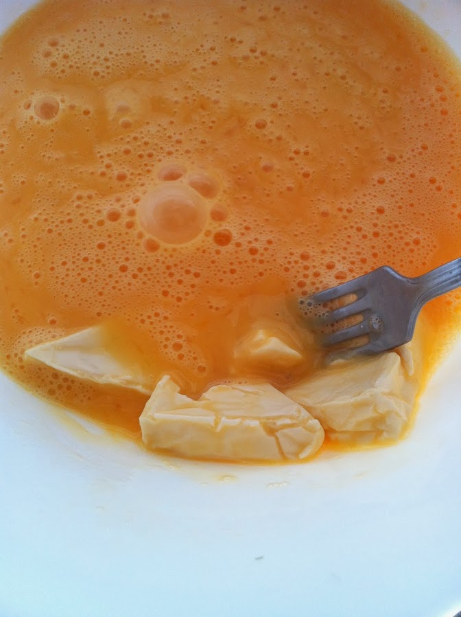 Cuando el calabacín este blandito, iremos preparando los huevos con los quesitos en un bol.