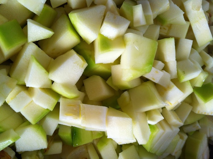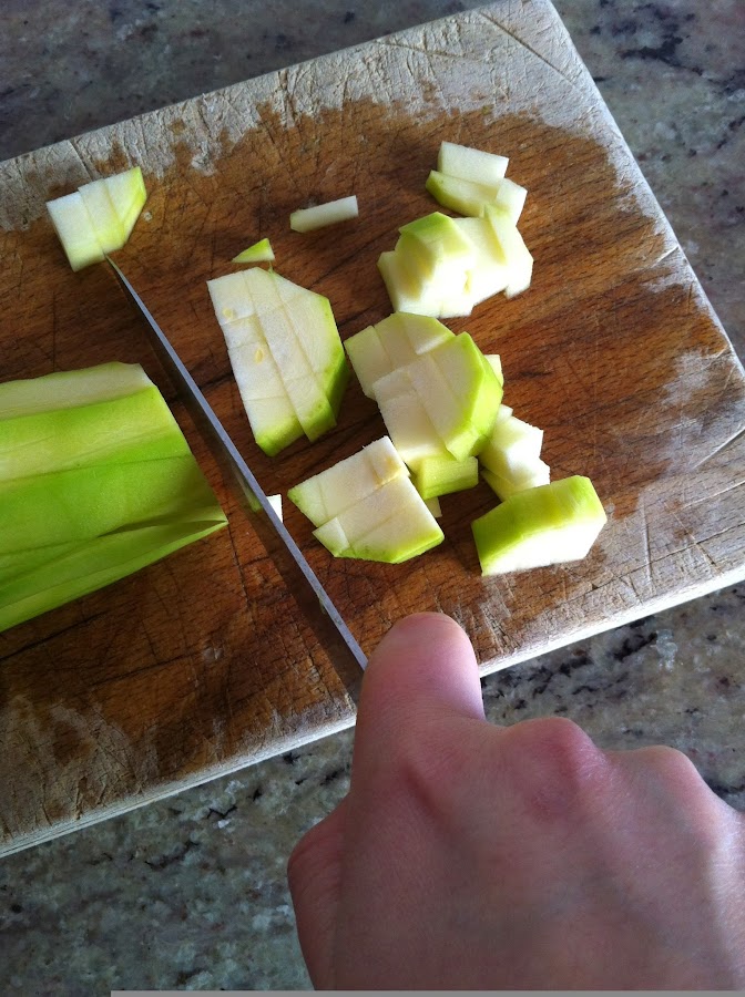 Seguido, pelaremos los calabacines, y los cortaremos de la misma manera. En pequeños cuadrados.