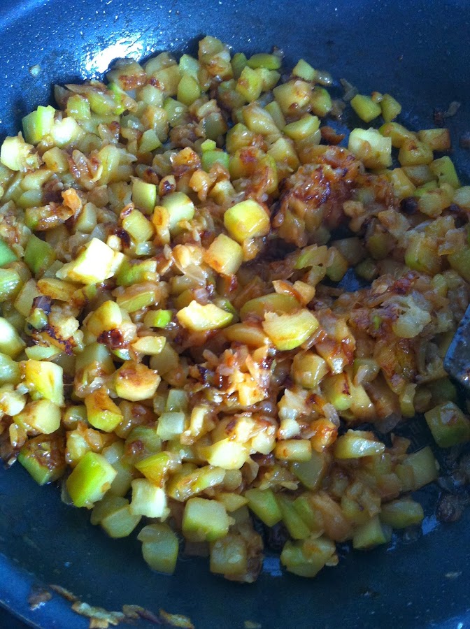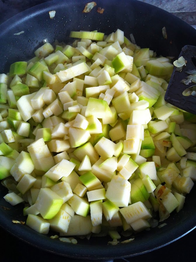 Cuando este todo picado, lo añadiremos a la cebolla con un poco mas de sal, y a fuego medio, lo cocinaremos removiendo de vez en cuando.