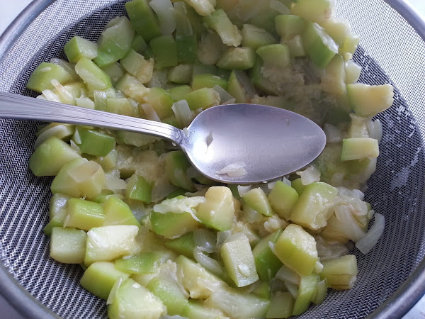 4. - Una vez esté el calabacín, pasamos el sofrito a un colador y con una cuchara escurrimos bien, para que el calabacín suelte el máximo de agua posible.