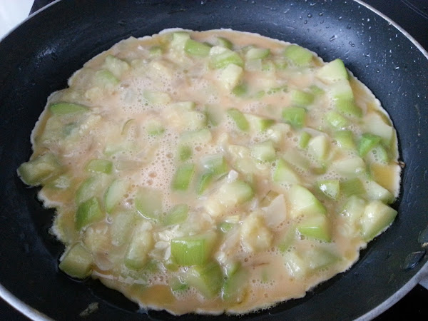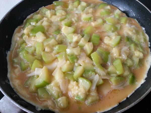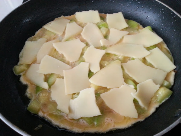7. - Echamos por encima el resto de los calabacines y dejamos que se vaya cuajando. Aconsejo tapar la sartén, para que tarde menos tiempo.