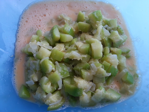 5. - Ponemos la sartén en el fuego con un poco de aceite, a fuego medio-bajo. Batimos los huevos, le añadimos los calabacines bien escurridos y cuando el aceite esté bien caliente, echamos la mitad de la mezcla en la sartén.