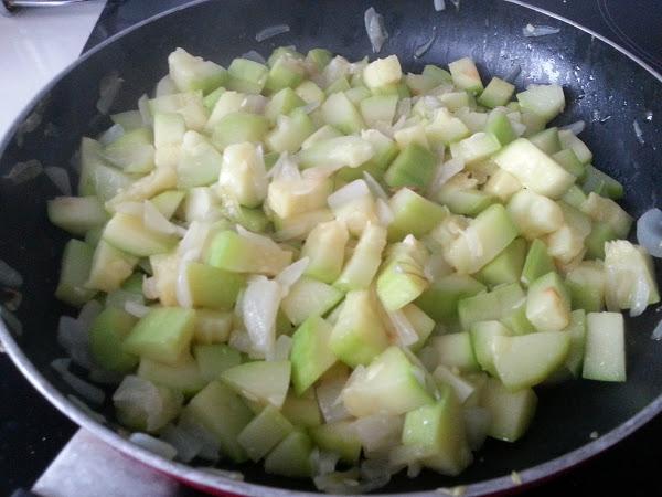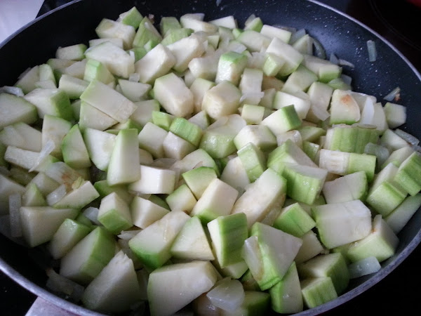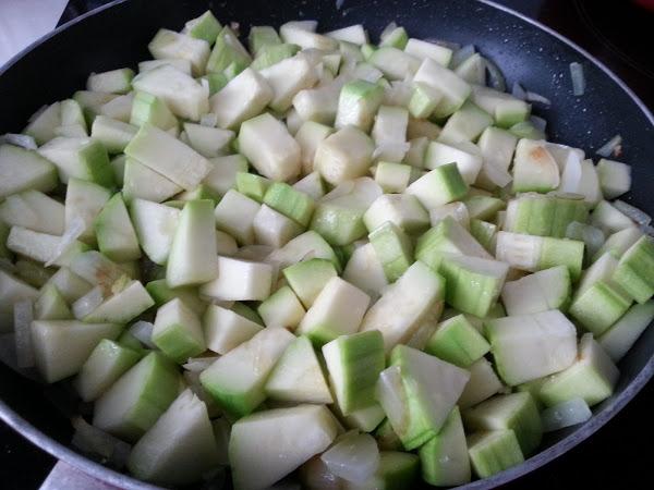 3. - Una vez la cebolla está transparente y blandita, le añadimos los calabacines troceados y salteamos unos 10- 15 minutos, hasta que el calabacín esté tierno, pero que no se deshaga.