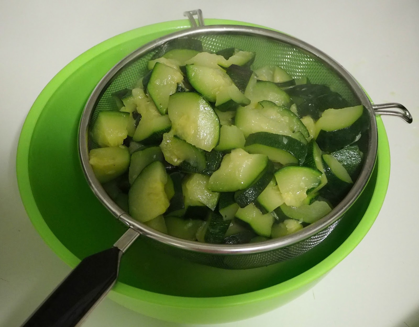 - Cuando los trozos estén bien blanditos y se empiecen a deshacer, apagamos y ponemos la verdura en un colador para que suelte bien todo el líquido. El calabacín suelta mucho agua, y si no lo escurrimos bien la tortilla no quedará como debe.