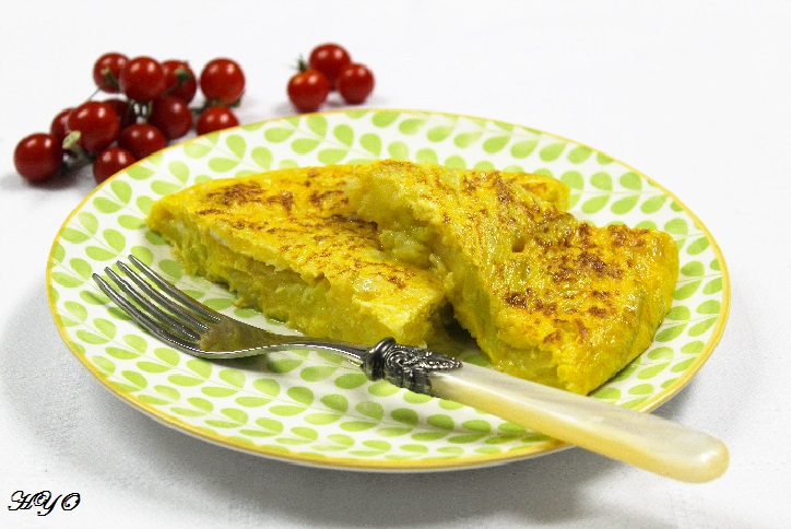 1. Pelamos el calabacín, lo cortamos a lo largo en bastones gruesos (3 cm aprox.) y luego en láminas, igual que para la tortilla de patatas.