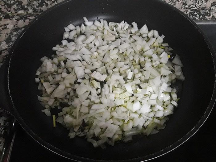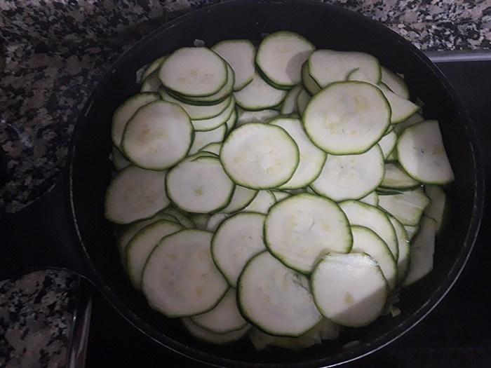 En una sartén, con una pizca de aceite caliente, ponemos a pochar la cebolleta a fuego suave. Cuando empiece a estar tierna y transparente añadimos las rodajas de calabacín, salamos y dejamos cocinando hasta que haya soltado toda el agua y esté tierno.