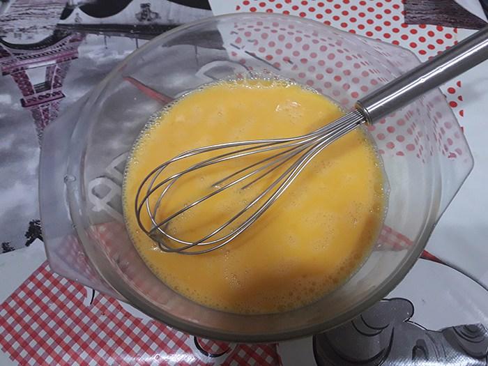 Mientras se pochan el calabacín y la cebolleta, batimos los huevos en un bol y salamos ligeramente. Una vez que las verduras estén cocinadas las escurrimos muy bien (es importante que no quede líquido para que la tortilla cuaje) y las incorporamos a los huevos batidos. Movemos para que luego queden repartidos los calabacines en la tortilla.
