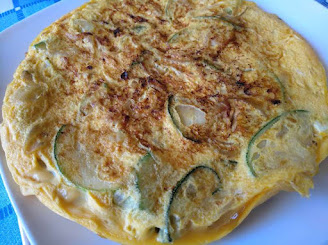 Con parte del huevo aún líquido, pero cuando veamos que los bordes ya empiezan a cuajar, le damos la vuelta a la tortilla (es posible que se pegue un poco el calabacín, pero no pasa nada, volteamos la tortilla sobre él).