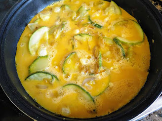 Subimos el fuego y vertemos el huevo sobre los calabacines que previamente habremos repartido de forma uniforme en la sartén.