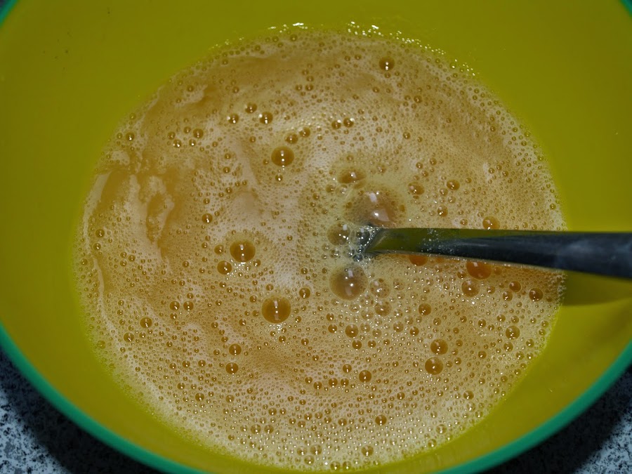 - A continuación batimos muy bien los huevos, o huevos y claras, salpimentamos (cuidado con la sal! Recordad que la calabaza ya lleva un poco), añadimos un chorro de leche, la cebolla dorada. Movemos bien.