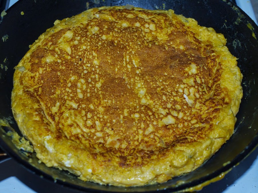 - Ponemos más aceite en la sartén, calentamos y añadimos la mezcla de la tortilla. Ya solo queda cuajarla. Para ello dejamos hacer por una cara cuidando de que no se nos pegue. Yo suelo pinchar con un tenedor para que se haga bien por dentro. Damos la vuelta y hacemos lo mismo. Las veces necesarias hasta que esté hecha a nuestro gusto.