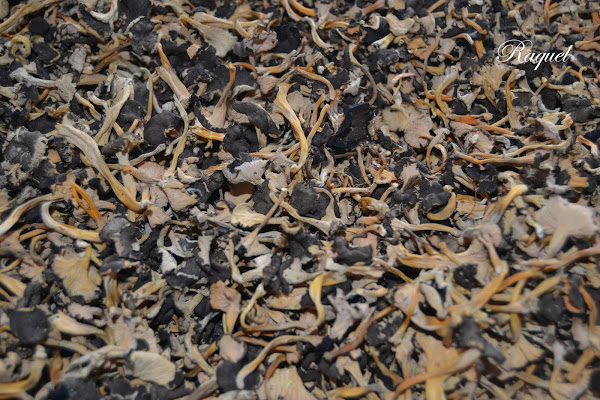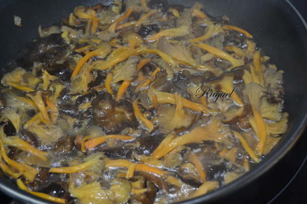 Limpiamos bien las setas y le damos un agua rápida para quitar restos de tierra pero sin mojarlas mucho, en el caso de deshidratadas las ponemos en un bol con un poco de agua, las movemos un poco y las dejamos unos quince minutos, por cierto importante si son deshidratadas no pongáis medio kilo, echar un buen puñado teniendo en cuenta que una vez estén hidratadas crece su tamaño el doble o algo mas, yo solo aviso!!