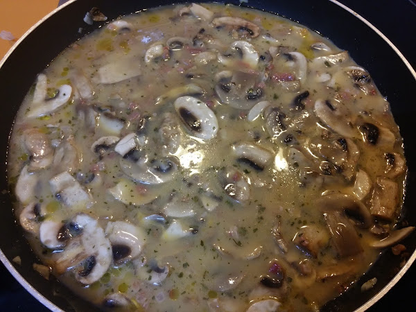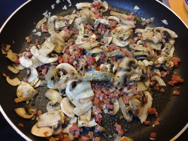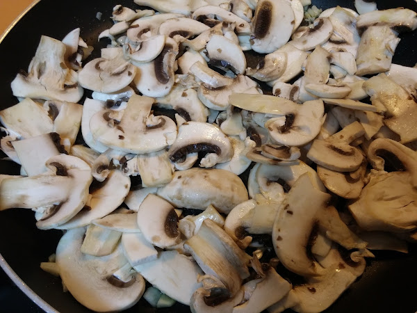 Añadimos los champiñones bien lavados y escurridos. Salpimentamos y dejamos unos 5 minutos.