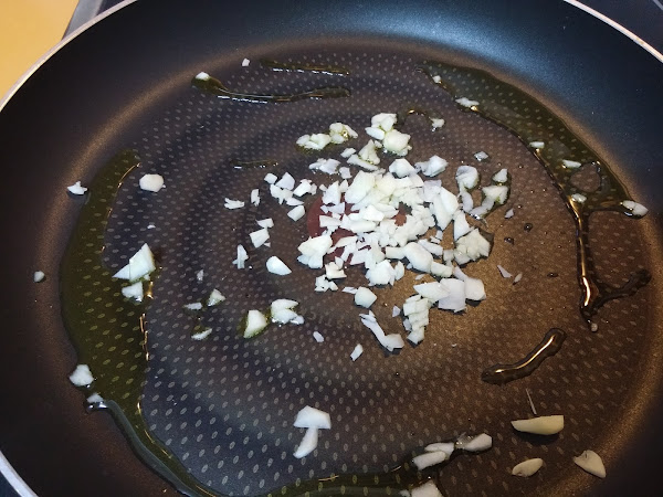 Pelamos los ajos y los picamos finitos. Los vamos a sofreír en una sartén amplia con un poco de aceite. Los vamos a dejar sólo un momento para que no se tuesten.