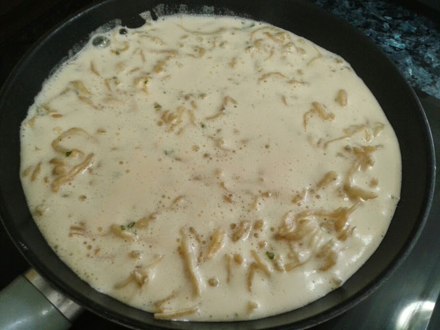Calentamos en una sartén antiadherente un par de cucharadas soperas de aceite y le añadimos la mezcla.