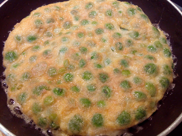 Cuando el aceite esté caliente (sin que llegue a humear), siempre a fuego lento, agregar los guisantes de forma que el huevo junto con los chicharos se reparta por toda la superficie y tapar la sartén.