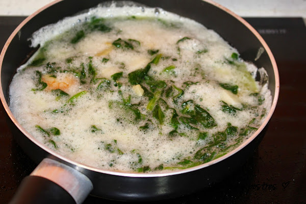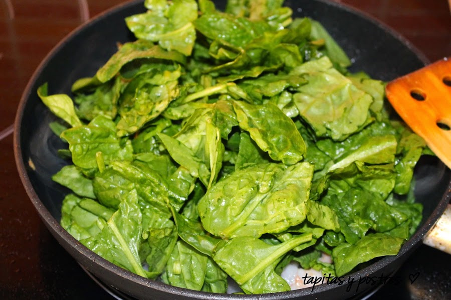 Agregamos las espinacas y tapamos para que se cocinen con el vapor. Dejamos unos minutos hasta que reduzcan su tamaño.